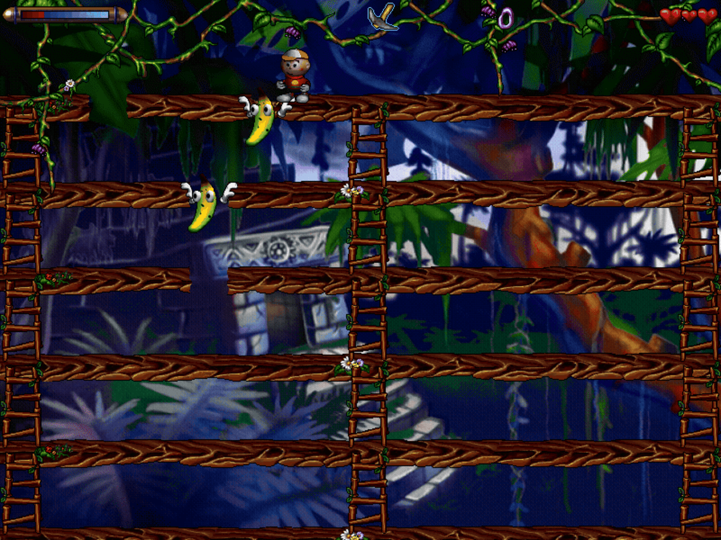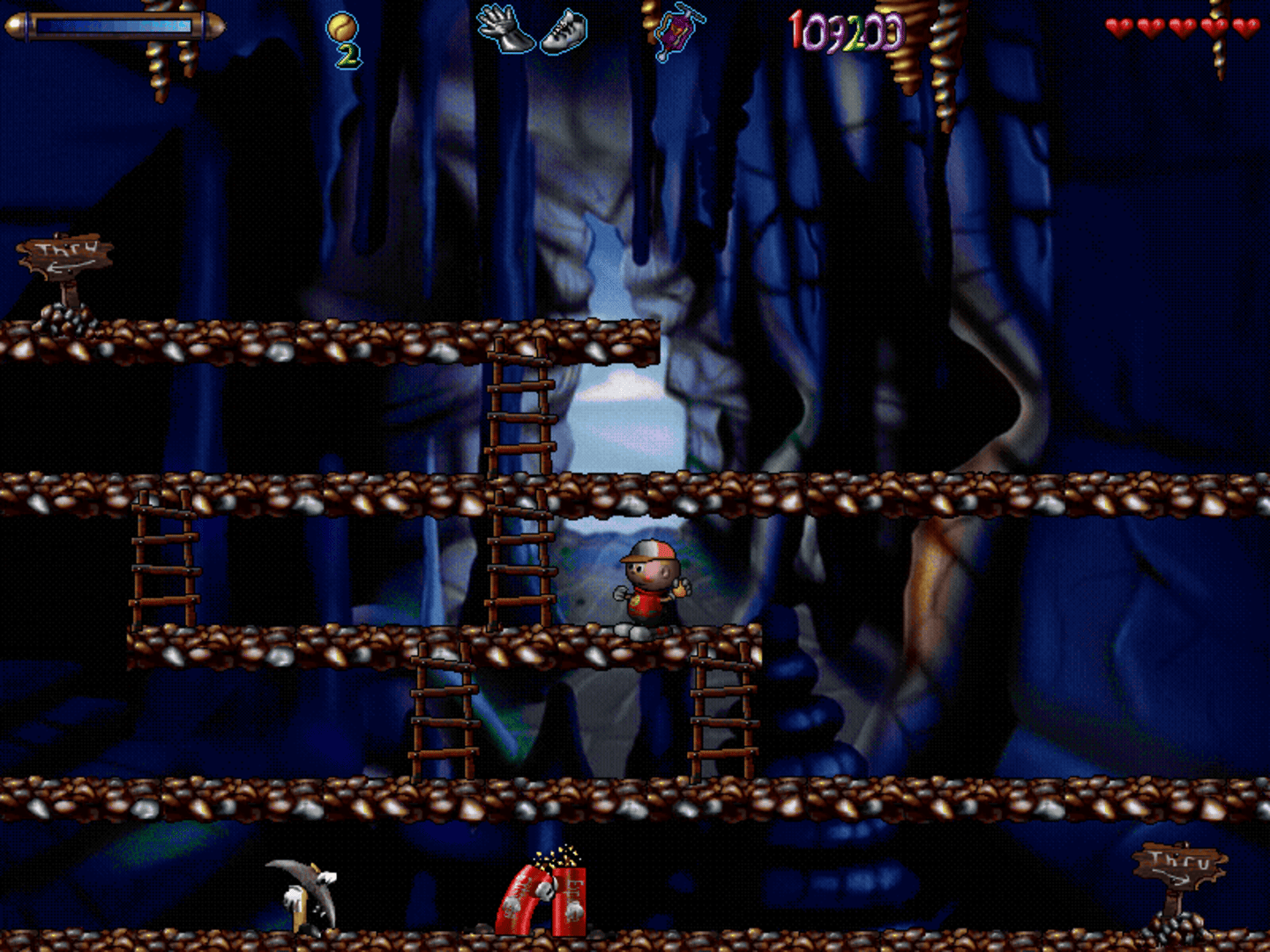 Catch enemies in holes and drop them to the floor below. In the levels are several goodies to find, e.g. tennis balls which can be thrown at the enemies or bombs which decreases time needed to dig a hole. There are five worlds with different themes like a building site, caves or Egyptian ruins. The player has to beat a whole world before he can save the game.