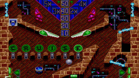 A sci-fi themed pinball game on the TurboGrafx-16. The pinball can activate time machines which sends it to bonus tables in different time zones. Time Cruise is a pinball game from FACE with a sci-fi theme and multiple tables. Unlike most pinball games with extended play zones, these tables are to the left and right of the core table, and the pinball can switch between them by passing through connecting tunnels. In addition, the player can power up time machines by hitting several levers with the pinball. Entering a time machine takes the pinball to a number of different time zones, each providing a possible score boost or extra ball.