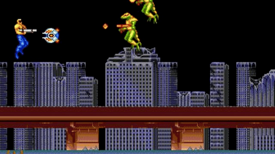 Forgotten Worlds can be played by up to two players simultaneously. The player controls a flying muscle-bound soldier armed with a rifle with unlimited ammo. The Player 1 character is equipped with a long-range automatic rifle, while Player 2 has a short-range wide shot. The controls in the original coin-op version consists of an eight-way joystick for moving the character in the air while flying and a unique rotatable button known as the "roll switch".Rotating the switch left or right allows the player to adjust their character's aim in one of sixteen directions, while pressing it causes the player character to shoot his gun. This allows for the player to move their character anywhere while keeping their aim in one direction. Pressing the switch rapidly will cause the character to perform a "megacrush" attack will destroy all on-screen enemies, but at the expense of a portion of their vitality gauge. The player character is accompanied by a satellite module orbiting near him that will provide backup firepower every time the player fires their gun. Like the main character, the satellite can also be rotated with the roll switch. Rotating the character while firing will only rotate the aim of the satellite, while rotating the character without firing will not only rotate the satellite's aim, it will also move its relative position around the player. The player can obtain blue-colored coins known as "zennies" from defeating enemies throughout the game. The zennies are used as currency to obtain new power-up items from shops located at certain points in each stage. When the player enters an item shop, they are given a choice of the items available and a limited time to make any purchase they wish. These items consists primarily of new weapons for the satellite module, but also includes a health kit to restore lost vitality, an armor that allows the player to sustain additional damage, and even tips on how to defeat the boss awaiting at the end of the current stage. Forgotten Worlds consists of five stages with a total of eight bosses. The player will lose if their vitality gauge runs out, but will be given a chance to continue.
