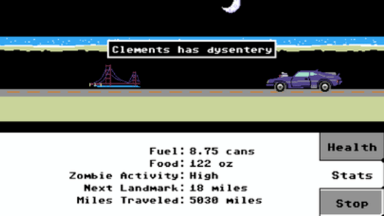 In The Organ Trail, players must cross a post-apocalyptic United States in an old station wagon in order to reach a sanctuary free of zombies. Players must manage their limited resources, including food, ammunition and fuel for their vehicle, in order to complete their journey and keep everyone in their party alive and healthy. At the beginning players can choose from a number of characters to play as including a cop from Kentucky, a clerk from New Jersey, or a lawyer from Miami. Each character has different bonuses in gameplay; for example the cop will offer more hours for the player to scavenge for supplies at the beginning of the game but will earn less points if the player beats the game, while the lawyer will give the player the least time to scavenge for supplies but earn the most points.