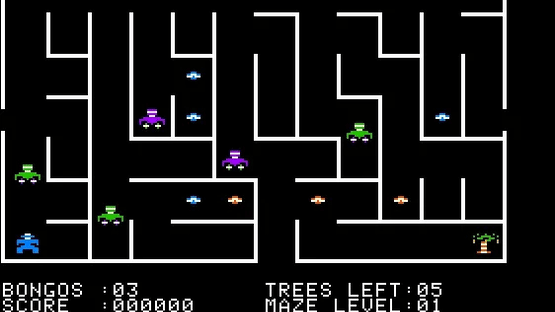 You are Bongo the gorilla and you're being pursued by evil robots. Your job is to collect the coconuts and leave the maze while avoiding the robots or dropping trees in their path leading them to a fiery demise. Very much like Pac Man.