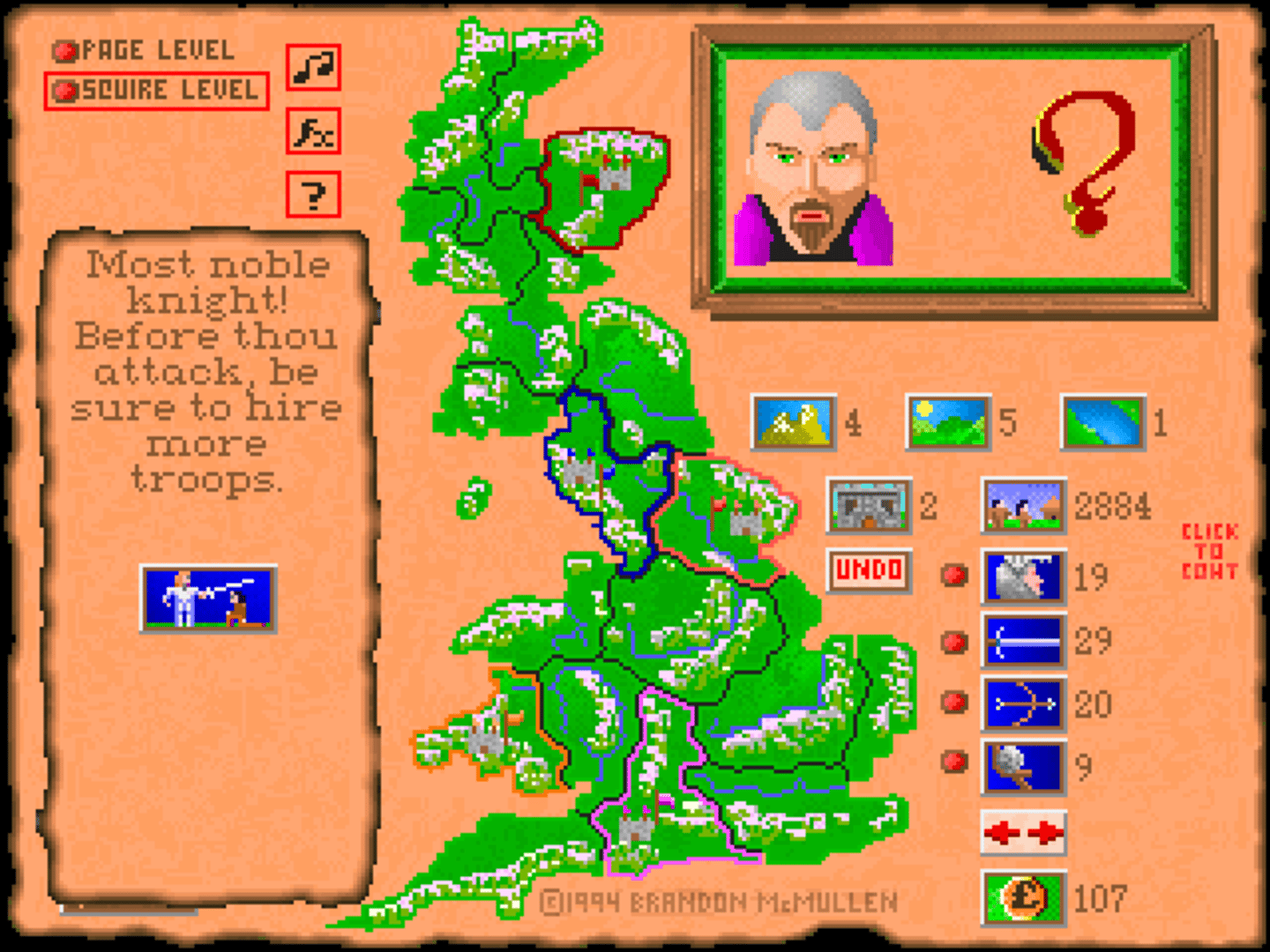 Terrific Medieval strategic war game in which you must conquer Great Britain. 256 color VGA graphics, wonderful theme music, digitized sound effects and voices! Who says valor and chivalry are dead. Prepare for battle and the return of King Arthur!