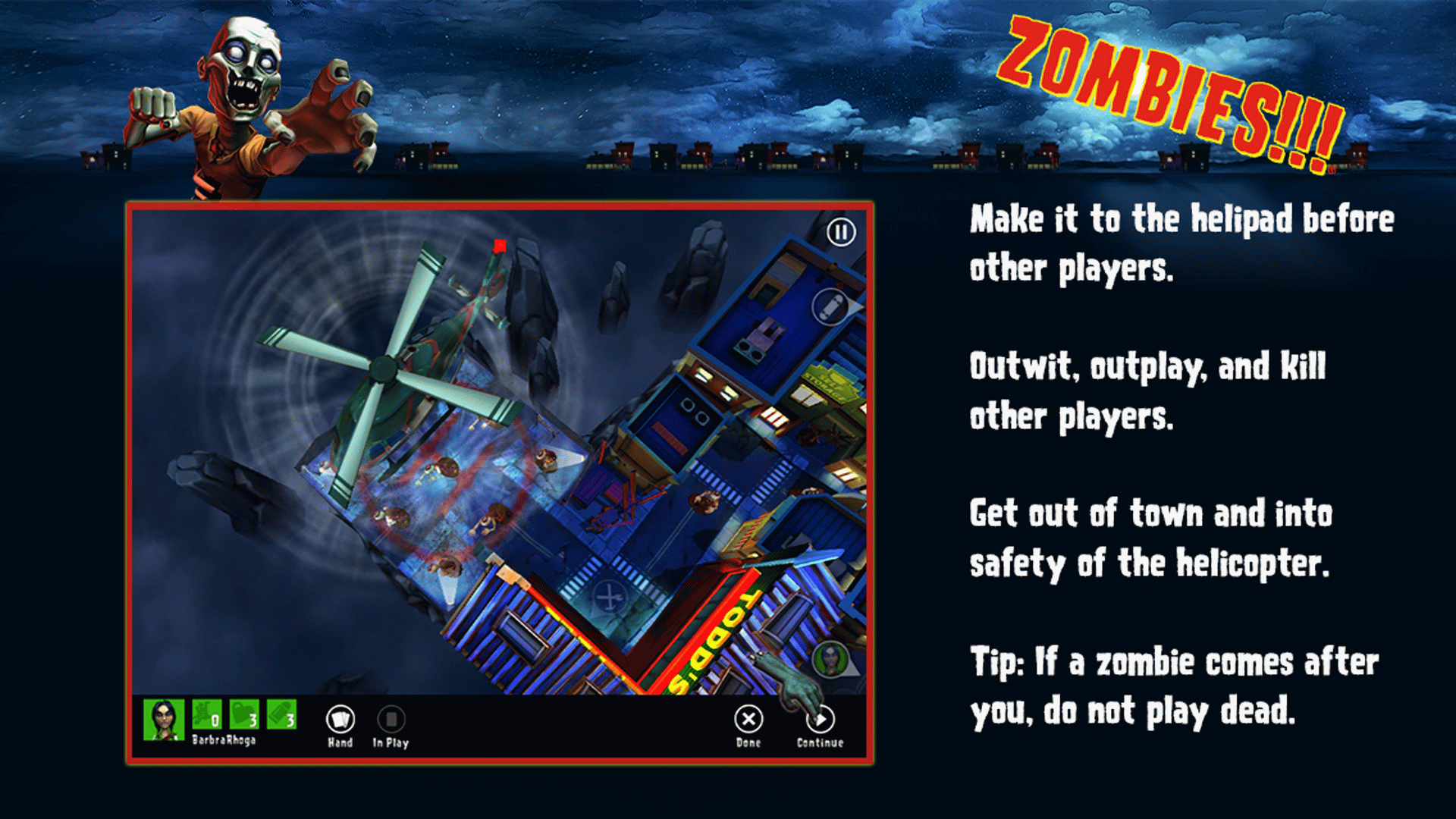 Zombies!!! the popular board game from Twilight Creations Inc. comes to Windows Phone 7 and Windows 8. Zombies!!! is a video game adaptation of the popular tile-based board game by Twilight Creations Inc, publisher of the original game. The game was initially to be developed by Big Rooster for PlayStation Network, Xbox Live Arcade and Windows PCs through Steam, with possible versions for the Wii and the Nintendo DS. However, only Windows Phone 7 and Windows 8 versions have been confirmed after development of the game was resumed and taken over by Babaroga.