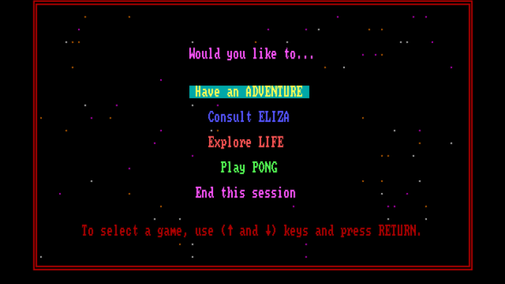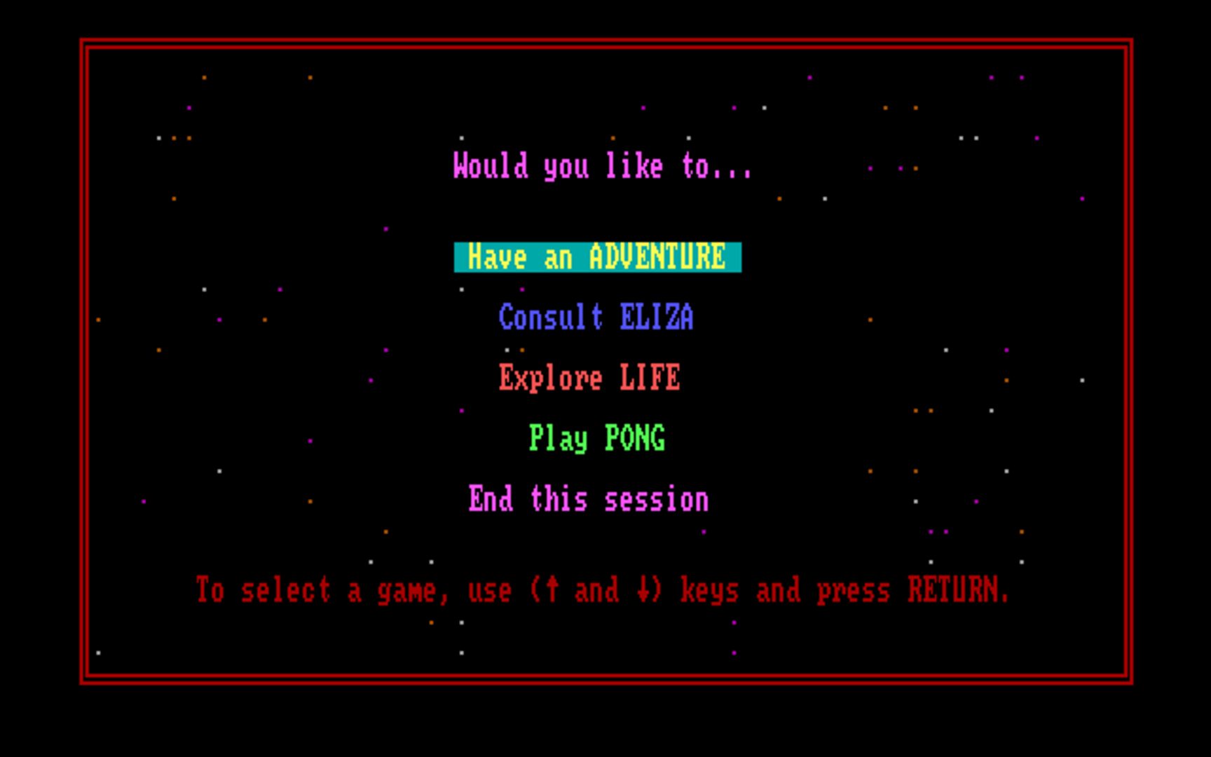 A compilation of four games; released in 1985. Play Eliza, Conway's Life, Crowther's Adventure, or Al Alcorn's Pong.