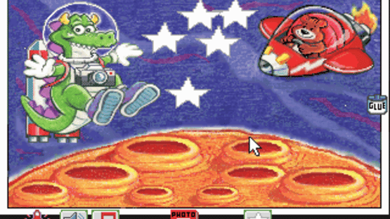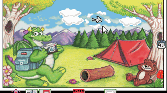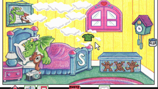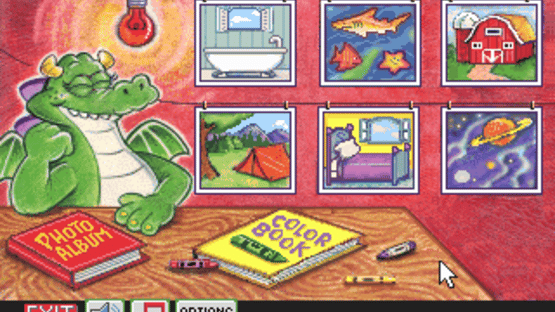 In this educational game, you should help Snap Dragon, accompanied by his friend Teddy Bear, to make his photo album. Choosing one of the six locations (bathroom, underwater, farm, camping, bedroom, space), you should sort several items (4-10) on the screen and make a shot to add new photos to an album. Animation of movable items and characters is present, entertaining the kid play. The Coloring Book with the 12 images available to paint is present also on another side of the game. During the painting, the image may be printed.