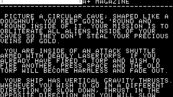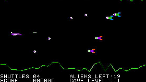 You are in a spaceship and are "cleaning up" a new planet we've found so it's safe to colonize it. Your mission is to destroy all the crazy aliens flying around in the various underground caverns and when they're clear, move on to the next cavern. There are a few different aliens types in the new caverns, but the color of the caverns changes every level. This game is a crude clone of Konami's classic 1981 arcade hit, Scramble. You control your ship with the standard Apple II keys A, Z, arrows, spacebar.