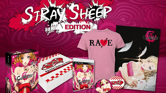 The Stray Sheep Deluxe Edition is exclusive to the EU release of Catherine. Includes game (with reversible cover of Catherine and Katherine), replica 'Rave' t-shirt, two Stray Sheep coasters, and a poster of Catherine, packaged in a Stray Sheep Pizza Box.