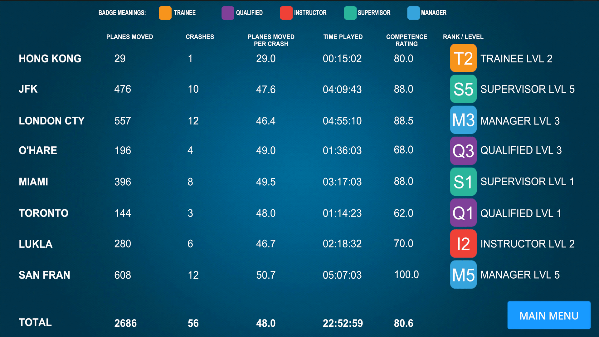 Our second volume of Airport Madness 3D compliments the first one with eight new airports, new aircraft, more gates, and sharper detail. Volume Two offers New York John F. Kennedy, Toronto Pearson, Miami, London City, San Francisco, Lukla Nepal, Hong Kong, and Chicago O'Hare. An all-new career stats page lets you track your performance history across all eight airports.