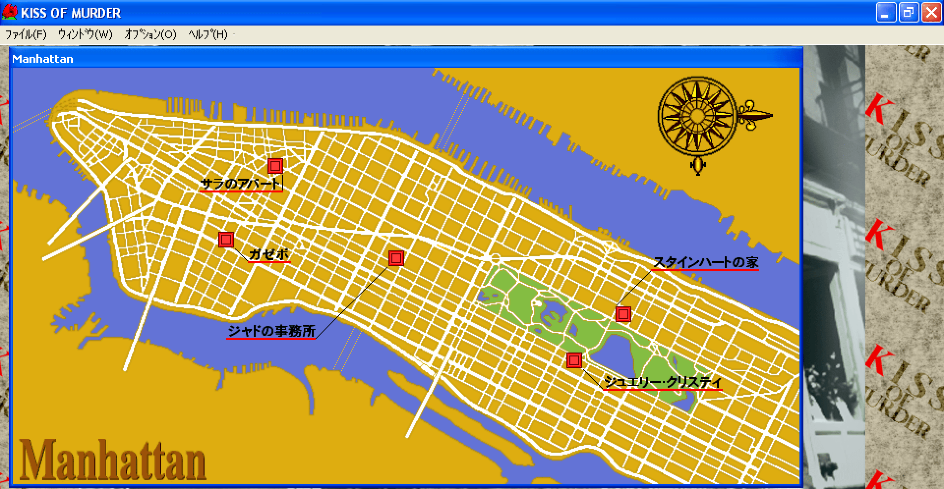Kiss of Murder is set in a parallel world to Manhattan Requiem, and while featuring the same set of characters as that title, has a completely different scenario. Early releases of the game were add-ons to "Manhattan Requiem" and used its graphical data. This version is a stand-alone release as a part of the Windows 95 Mystery Selection series.