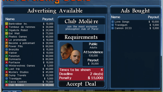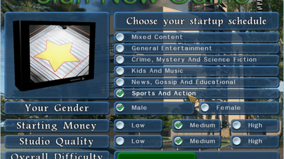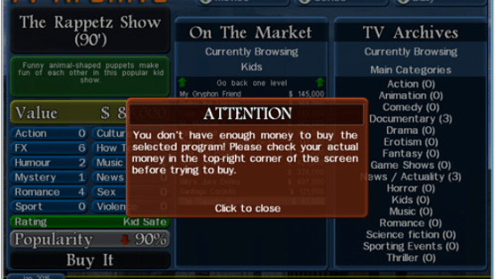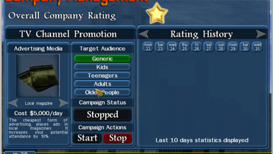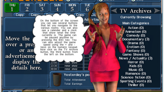 In this game, you'll take the role of a new manager, just graduated, which is appointed by an almost bankrupt TV Station, hoping that you'll be able to fix the situation and maybe even raise the TV Channel popularity.