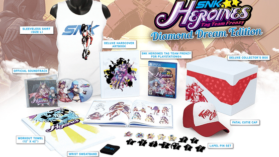 Diamond Dream Edition Includes: - SNK HEROINES Tag Team Frenzy for Nintendo Switch or PlayStation 4 - Deluxe Hardcover Artbook - 2-Disc OST - Lapel Pin Set - Sleeveless shirt (Size L) - Fatal Cutie Cap - Workout Towel (12" x 42") - Wrist Sweatband - Deluxe Collector's Box