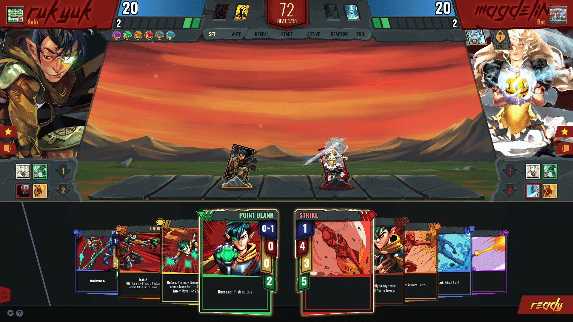 In this deeply strategic, full-information battle card game, choose your fighter from a diverse roster of spell-slinging duelists, tag-teaming werewolves, time-traveling boxers, dimensional knights, and more!
