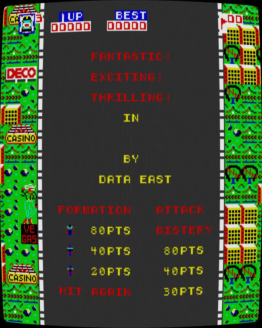 Also known as "Mad Rider" and "HWY Chase", Mad Alien is one of Data East's earliest arcade games. It's also the first game released on their cassette-based hardware. The gameplay is a mixture of Space Invaders and Monaco GP.