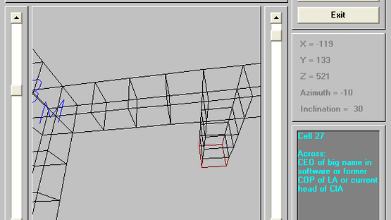 CyberSpace Crossword is a freeware three dimensional crossword puzzle. The player starts at a point in cyberspace some distance above the puzzle and navigates to it using three slider controls that adjust the player viewpoint in each of the three dimensions. Upon nearing the puzzle the game begins and the player is offered the first clues. Cell 1 is preselected for the player to enter a letter. None of the cells are numbered, however when selected a cell changes colour and any associated clues are displayed in a window in the lower right corner of the game area. Answers are entered letter by letter and to do this the player must select each cell individually, enter a letter, then select the next cell, enter the next letter and so on.