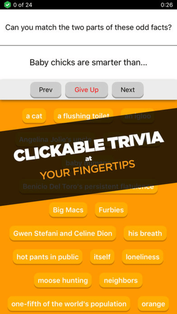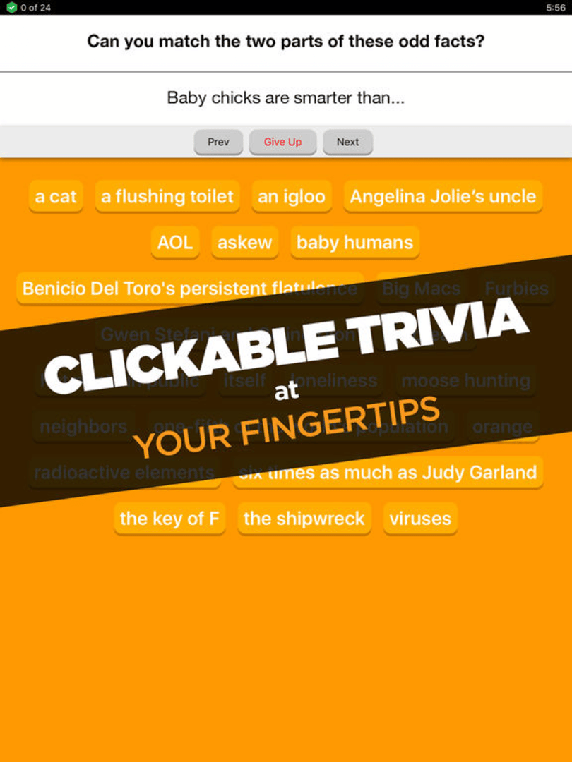 Sporcle brings the wildly popular and addictive trivia quiz website Sporcle.com to your iPhone/iPod touch and iPad! No matter what your interest -- be it sports, movies, television, music, geography, and more – you can find hours of trivia entertainment. The app downloads new quizzes every day – just launch the app to test your skills against Sporcle’s latest brain-teasing challenges. Sporcle is the fun way to kill some time or procrastinate while exercising your brain. You just might even learn a thing or two!