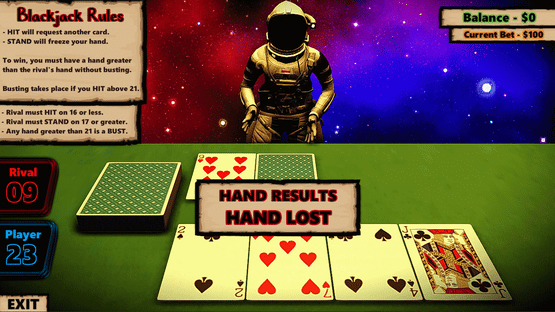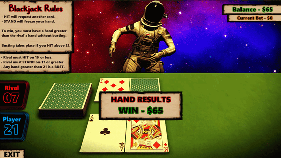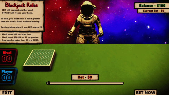 Blackjack In Space presents players with a peaceful Blackjack gambling simulation that takes place in outer space! Experience the highs and the lows in real-time as you try to double your money on every single blackjack hand.