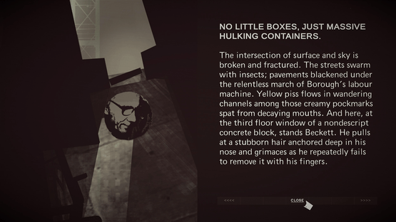 Beckett by The Secret Experiment is a surreal noir. A disturbing story of a missing-persons investigator, hired to find a young man suffering from a mental illness. It is a taste of the alternative - an experience that will make you question what it is to exist. It is a vivid musing on identity, memory and loss. It is unlike anything you will ever play. It wants to offend. Don't let it. Poor, poor Beckett.