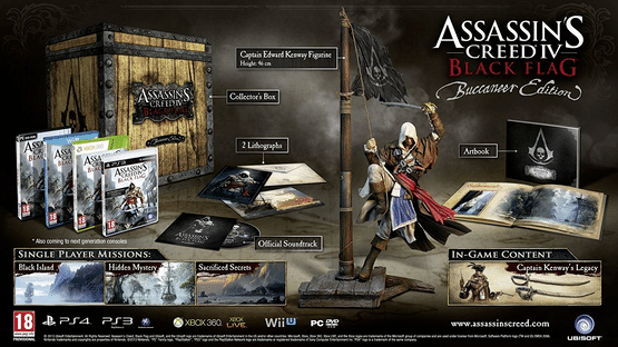 Welcome to the Golden Age of Piracy. The year is 1715. Pirates rule the Caribbean and have established their own lawless Republic where corruption, greediness and cruelty are commonplace. Among these outlaws is a brash young captain named Edward Kenway. His fight for glory has earned him the respect of legends like Blackbeard, but also drawn him into the ancient war between Assassins and Templars, a war that may destroy everything the pirates have built. A Brash Rebel Assassin: Become Edward Kenway, a charismatic yet brutal pirate captain, trained by Assassins. Edward can effortlessly switch between the Hidden Blade of the Assassin’s Order and all new weaponry including four flintlock pistols and dual cutlass swords. The Assassin’s Creed IV Black Flag Buccaneer Edition includes: A 45cm figurine of Captain Edward Kenway. Collector’s box. A high quality artbook including artworks that inspired the game. The Official Game Soundtrack. 2 lithographs in a protective envelope. Unlockable bonus content: 3 additional solo missions for an extra 45 minutes of gameplay: Black Island: Captain Morgan’s favourite ship has sunken off the coast with a full load of legendary sailing equipment. Explore the Black Island and retrieve these items Pirates have desperately been looking for. Hidden Mystery: Follow Stede Bonnet’s path and find the secrets of his adventures on the beautiful island of St Lucia. Sacrificed Secrets: Recover Captain Drake’s lost treasures, including golden flintlocks and cutlass when exploring the exotic island of Sacrifices. Additional Single & Multiplayer items: Captain Kenway’s Legacy.