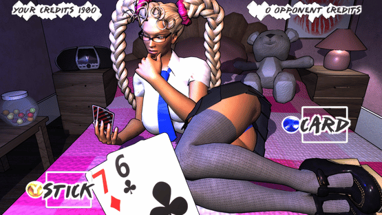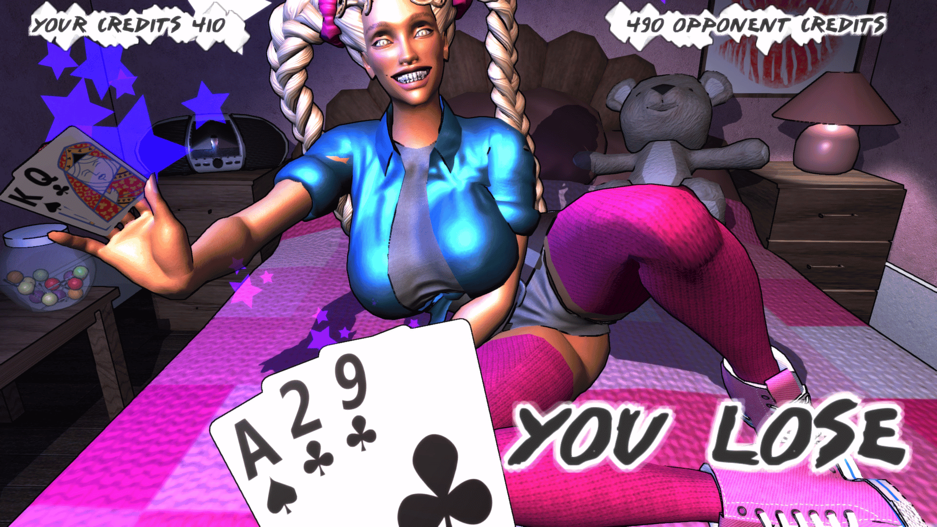 Play a simple version of the card game 21 with your sisters best friend. But when you start winning and she starts offering you her clothes to buy back in, what do you do?