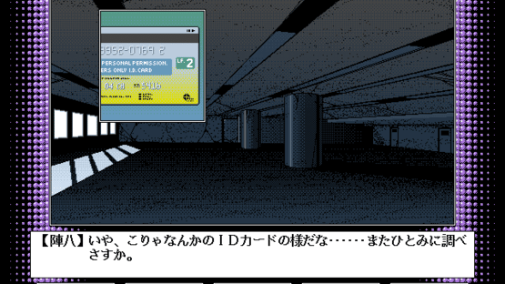 Jinpachi Tanaka is a paranormal investigator who possesses the powers of detecting and fighting demonic creatures. As these demons are usually female and pretty, they can easily pose as humans, and Jinpachi must use somewhat unorthodox techniques to tell friend from foe. Jinpachi and his employees must cooperate with the police and avert grave dangers posed by an angry female demon who has sworn revenge against the hero. Bacta is a Japanese-style adventure game. The player is presented with a text menu containing verbs, most of which lead to sub-menus with objects. Some of these commands are context-specific, while others ("Look", "Talk", "Move", etc.) are present in every situation. Sometimes events must be triggered by repeatedly selecting commands.
