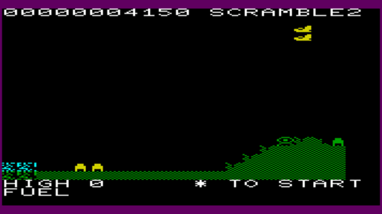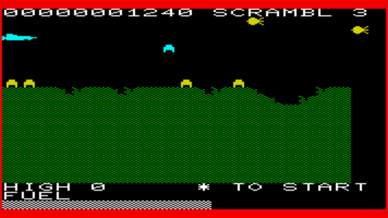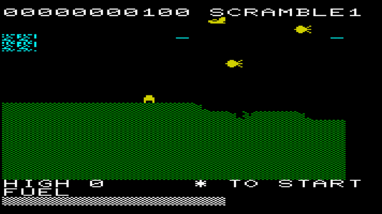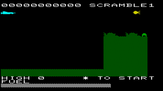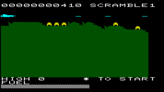 VIC Scramble is another Scramble game for the VIC-20, but with some alterations that make it stand out. As usual, you fly with a ship through a system of caves, but this cave lacks the usual roof. You shoot or drop bombs at the usual missiles, saucers and fuel pods, but in this version, you don't shoot and bomb simultaneously. Bombs are released by pulling back on the joystick with the fire button pressed. Of course, this means that you can't go back and forth as usual, instead your ship is glued to the back of the screen. While the scrolling is forced, pushing forward makes it speed up, so that you can fly away from missiles and other threats. As you go deeper into the caves, the border colour changes.