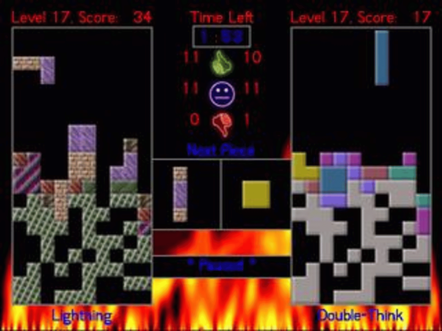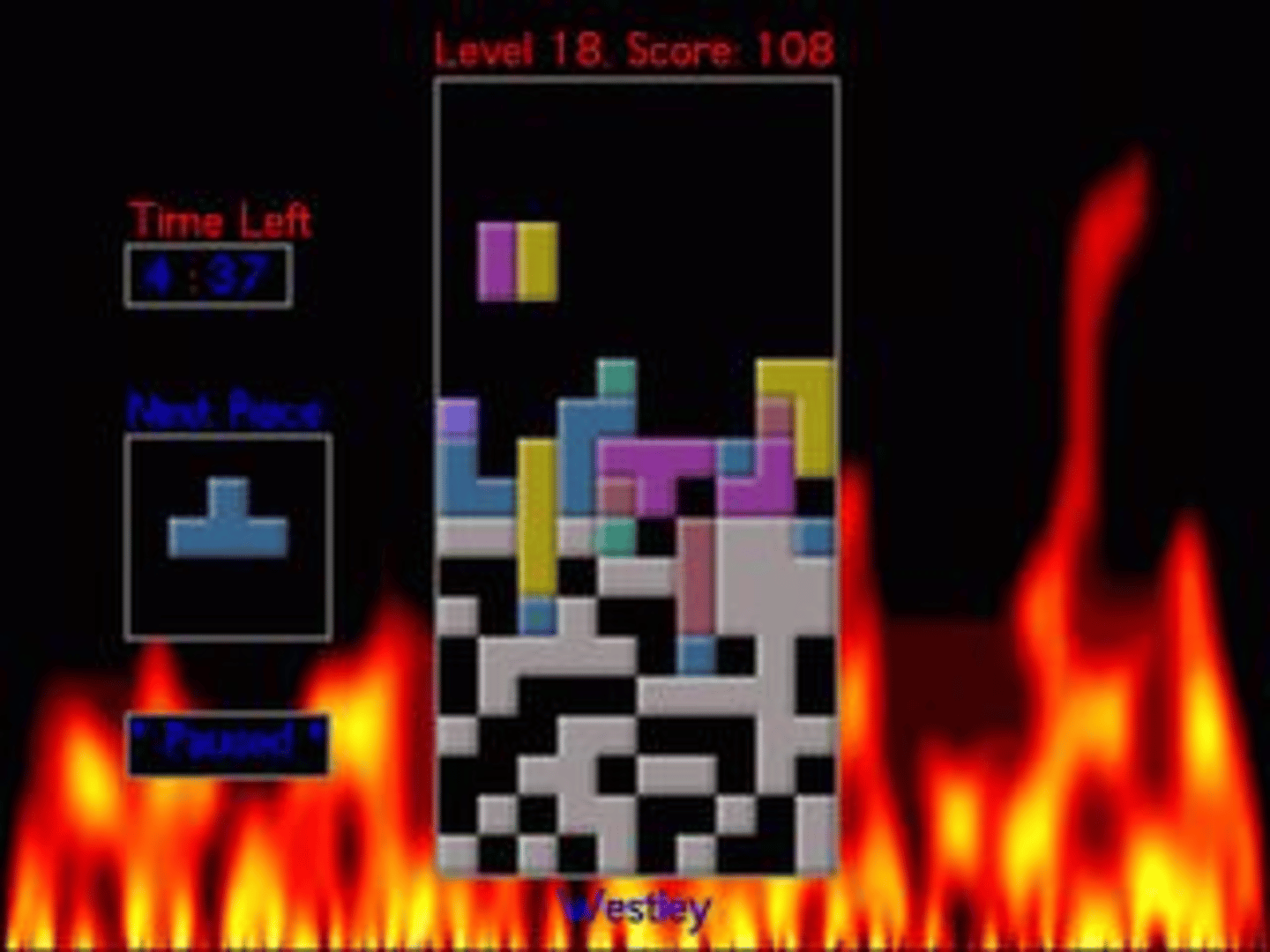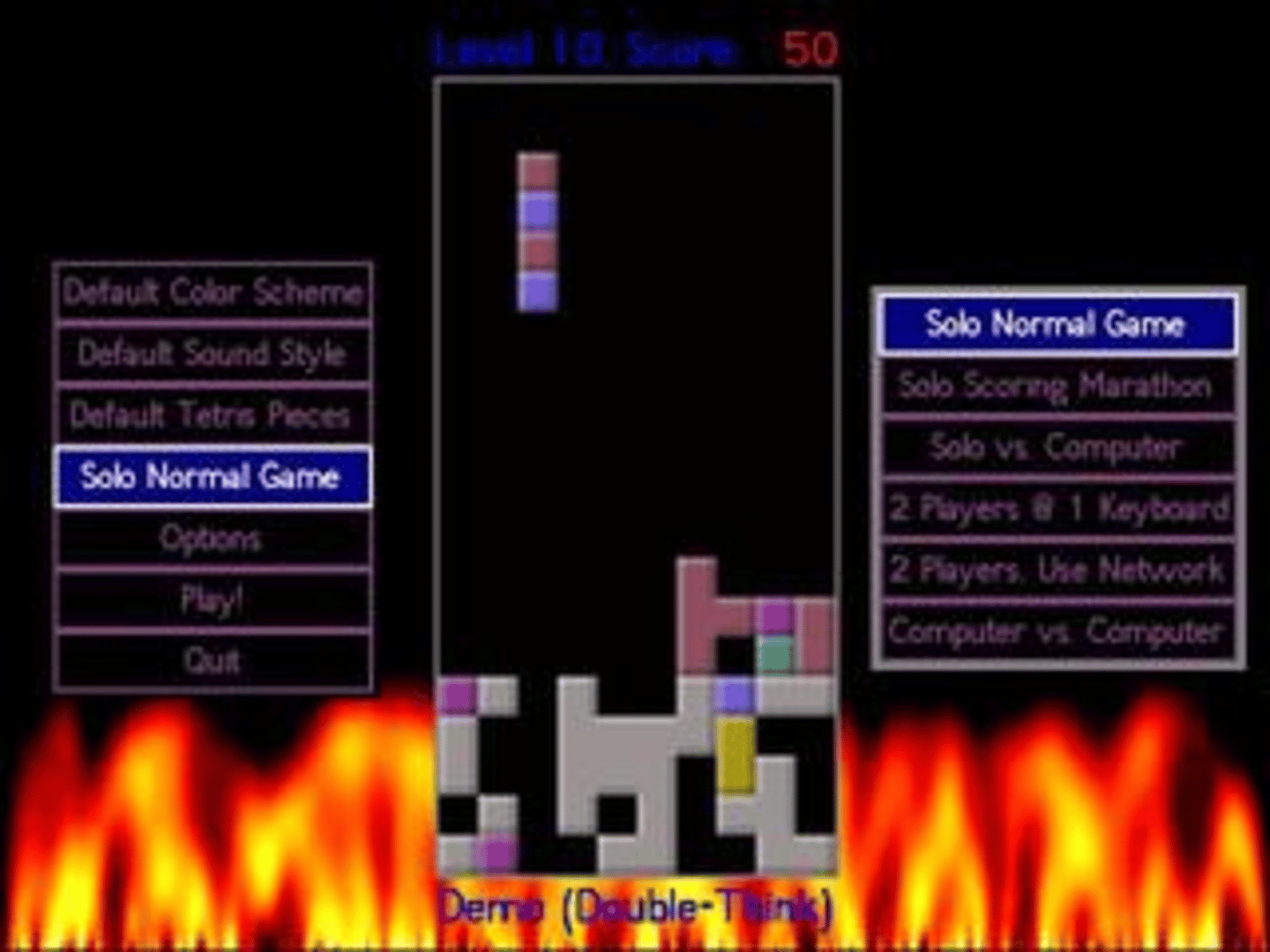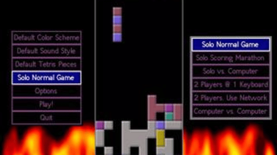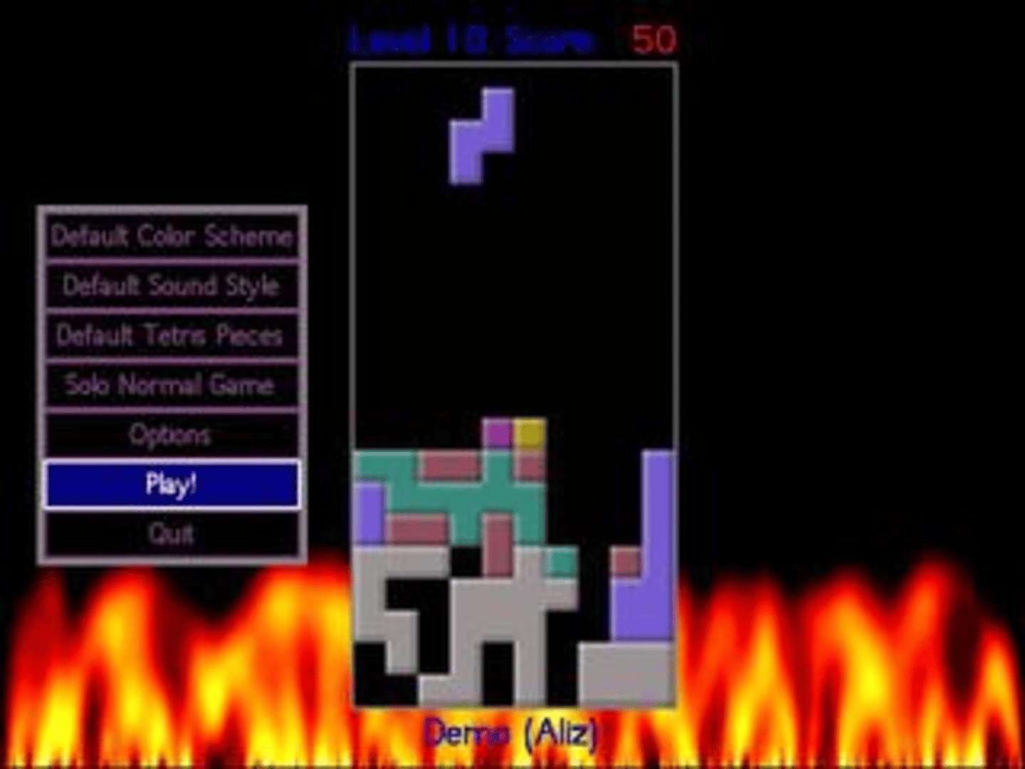 Alizarin Tetris is a freeware Tetris variant with several game modes and other features. The game area is 10 x 20 tiles in size and as standard every piece that drops down can consist of up to four smaller pieces which are affected by gravity. If you place two pieces of the same color together they will mend together into one piece. There are six game modes: Solo Normal Game, Solo Scoring Marathon, Solo vs. Computer, 2 Players @ 1 Keyboard, 2 Players. Use Network, Computer vs. Computer. If the standard tetris pieces feels too uninteresting to play with you can select to play with two other sets of pieces: "Planar Pantominoes" and "One-To-Five-Ominoes". To make the game even more interesting you can activate the "Power Pieces"-option. A Power Piece can be one of four different kinds: The bomb (destroys all adjacent tiles), The Down (pushes each tile directly beneath it down as far as it can go), The Drip (all non-garbage tiles adjacent to it change to be the color most commonly occurring on the board) and The Skull (destroys all non-garbage tiles adjacent to it). As standard there is no sound in the game but the user can add his/her own sound. The graphic style of the game can also be changed. There are 12 built in styles and additional styles can be created by the user.