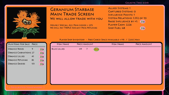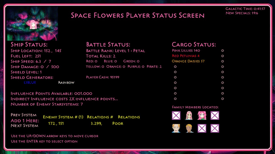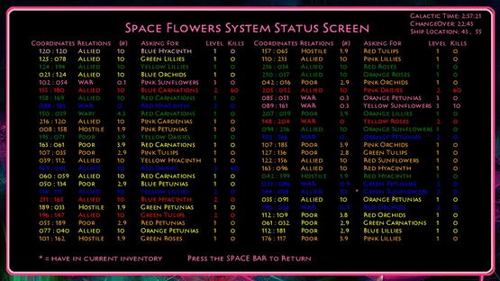 Space Flowers is an intra-galactic tradewars game. Buy and sell flowers as you upgrade your spaceship and explore the galaxy, locating lost family members along the way. Fight off an evil extra-galactic empire when you are ready. Great fun for all ages!
