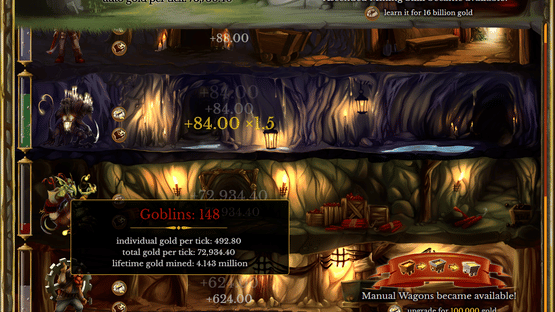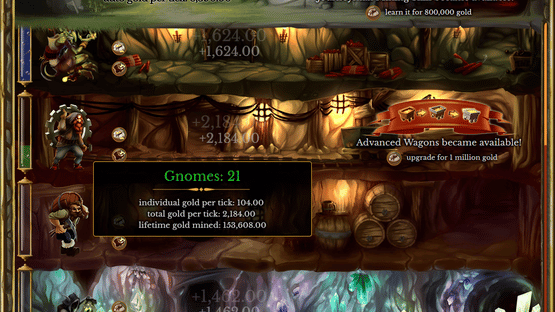 A casual clicker / resource management game in which you are tasked with running a fantasy goldmine.