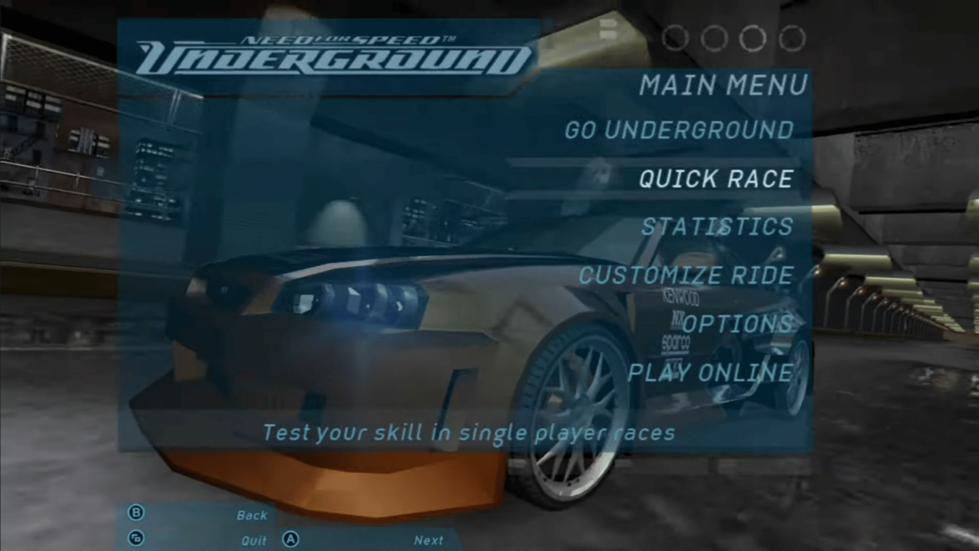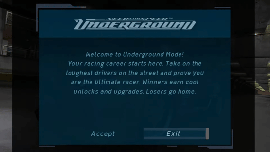 Need for Speed: Underground is a 2003 racing video game and the seventh installment in the Need for Speed series. It rebooted the franchise, ignoring previous Need for Speed games that featured sports cars and exotics. Underground is the first game in the series to offer a career mode that features a comprehensive storyline, as well as a garage mode that allows players to fully customize their cars with a large variety of brand-name performance and visual upgrades.