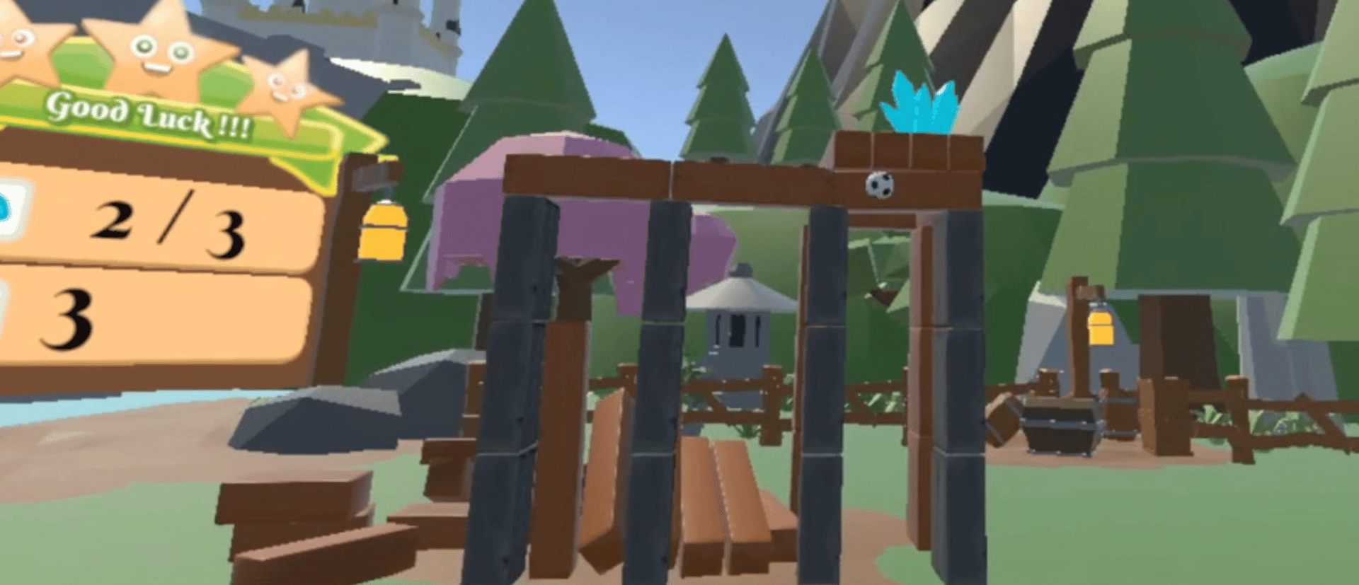Block Smashers is physics based VR puzzle game where you throw balls at structures to collect crystals. You collect crystals by either hitting them directly or taking out the supports holding them up. The goal is to get all the crystals on each level with as few throws as possible. There are three tiers of rewards: Gold, Silver, and Bronze based on the number of throws you take to collect all the crystals.