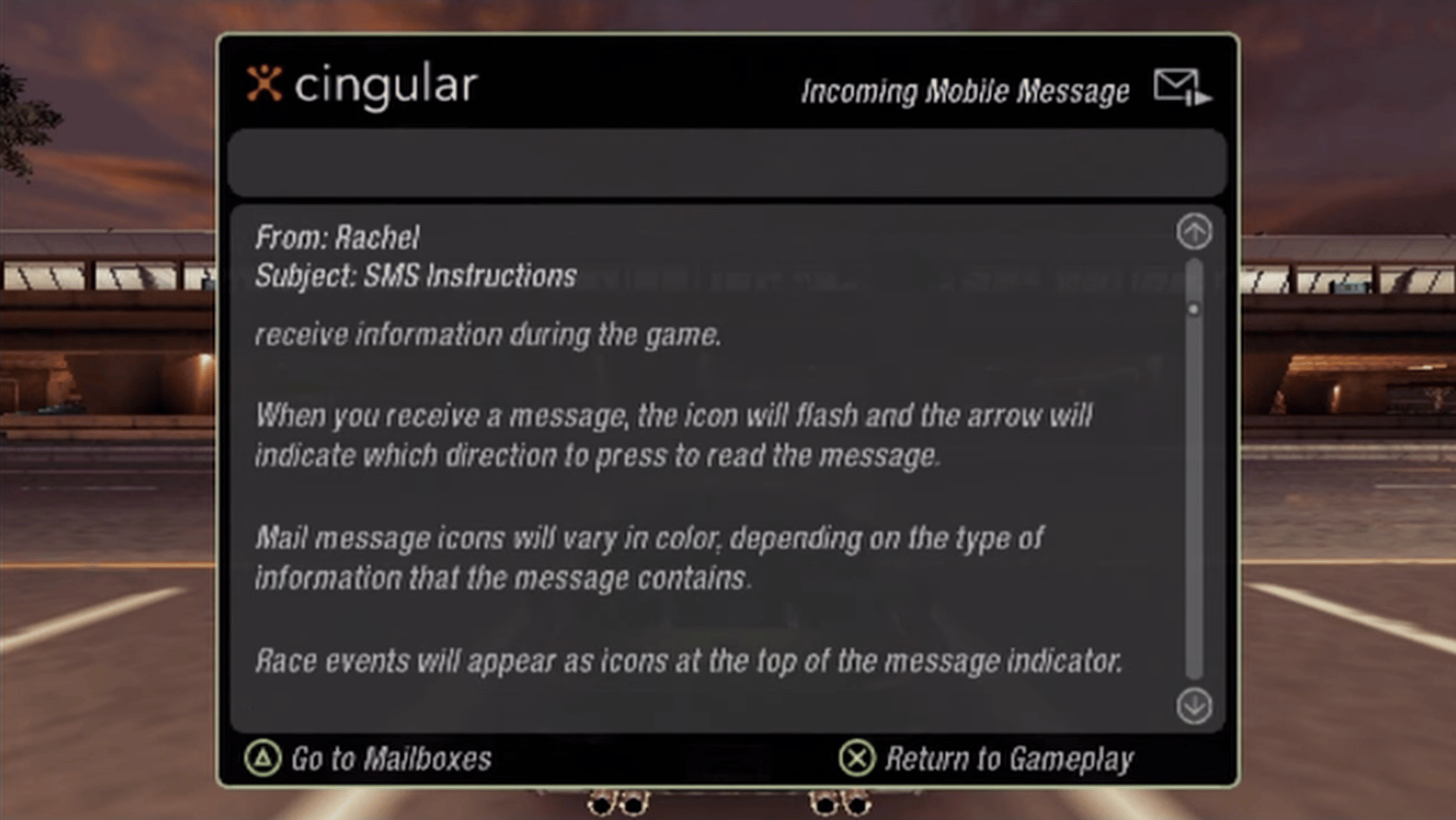 Need For Speed Underground 2 takes place in Bayview after the events of Need for Speed: Underground. The prologue begins with the player driving in a Nissan 350Z in Olympic City (though the racing scenes are actually in Bayview), the setting of NFS:UG. He then receives a race challenge from a rather ominous personality who offers him a spot on his crew, but "won't take 'no' for an answer." The player races off — despite Samantha's warnings — only to be ambushed by a mysterious driver in a rage that totals his Skyline. The driver, who has a unique scythe tattoo, makes a call confirming the accident, and the flashback fades out.