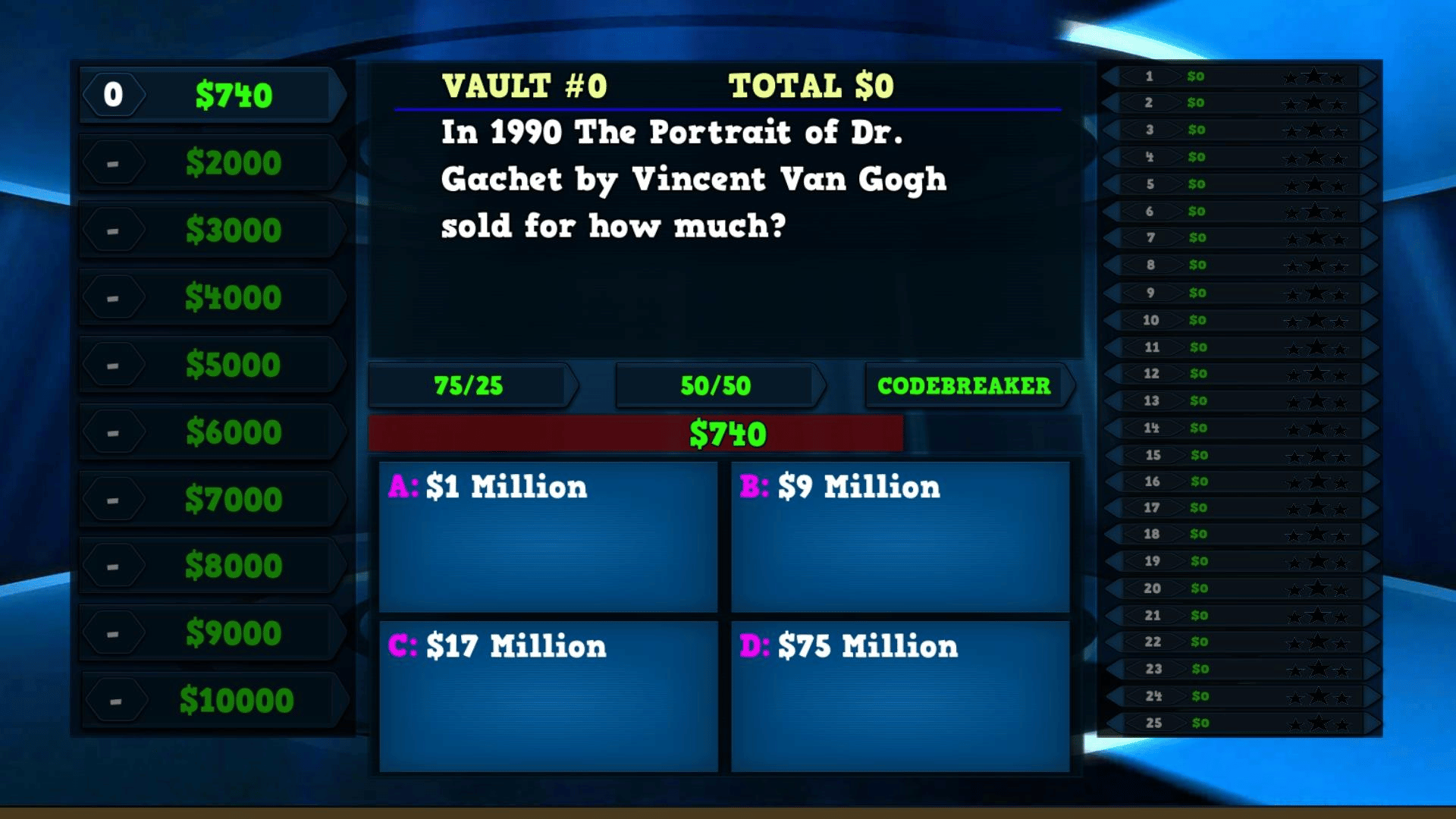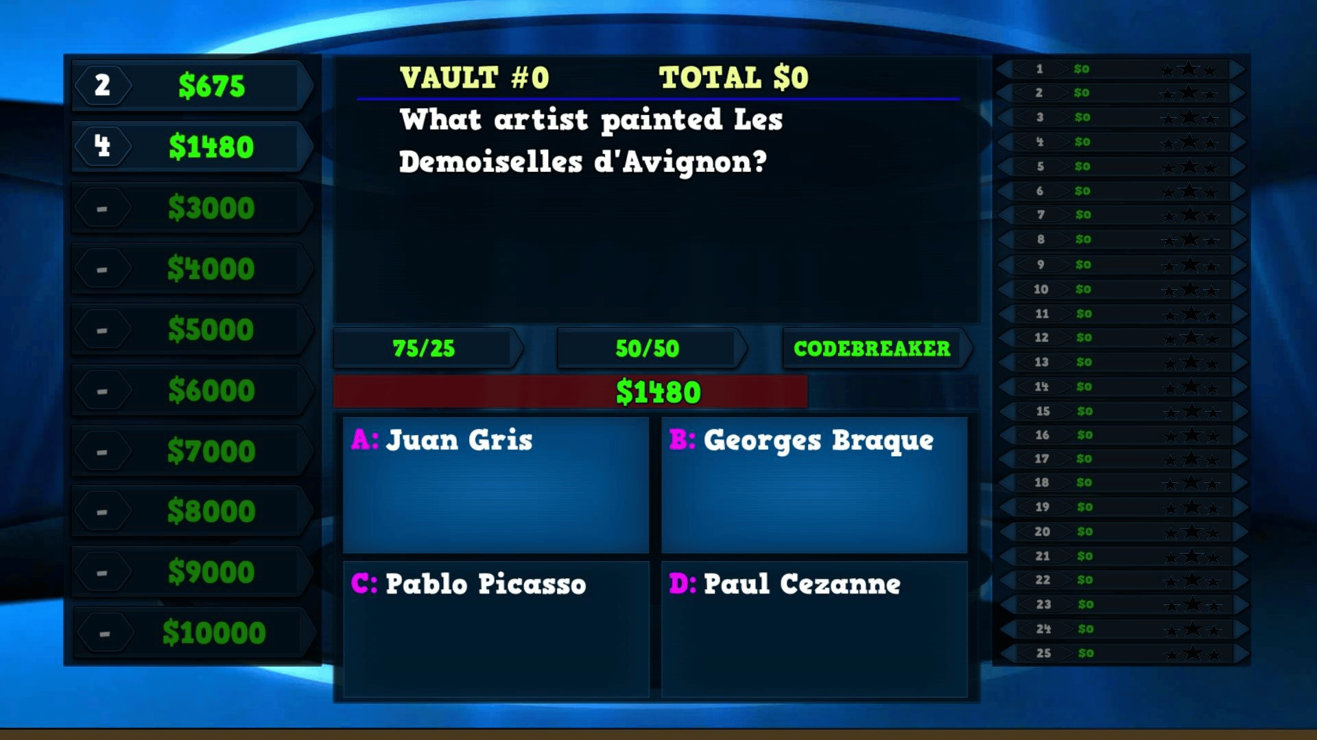 Welcome to the Trivia Vault contestant! Play as a contestant in a gameshow called Trivia Vault Art Trivia and bring your thinking hat. Answer art trivia questions as quickly as you can, the faster you answer the higher the cash value.