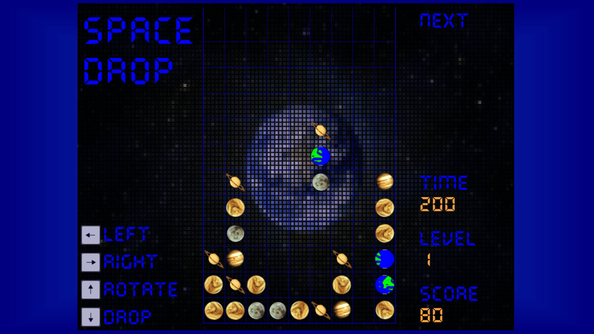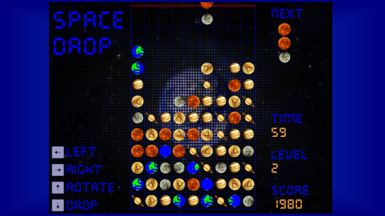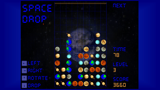 Planets and Objects fall from space. Match in 3, 4 or 5's. It sounds easy, but becomes increasingly difficult as the player progresses with the addition of more Planets/Objects.