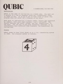 A text-based game of 3D Tic-Tac-Toe against a computer opponent. Originally, the game printed out the game board on teletype paper. It was later updated to include a visual display of the game board.