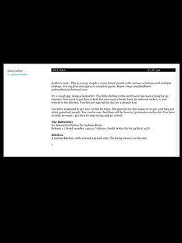 A time-based -each command counts for a minute- text-based adventure game of only two rooms, and with 5 objects to manipulate. It was created at 2015. It was found on playfic.
