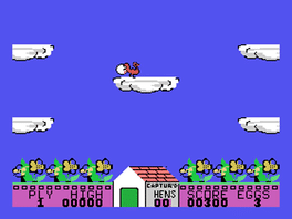 In this game you take on the role of a chicken who leaves the "Chicken Hens" base. From there other chickens are released and you must come down from above to turn them into an egg. Once they are an egg you can capture the egg and a point is scored. If you take too long they will once again return to a chicken and will need to be defeated from above. As the levels progress more chickens are released from the base.