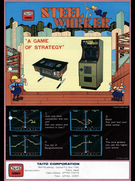Steel Worker is a reflex game that combines OH&S with the Japanese practice of just in time manufacturing. Each level starts with a mindless worker moving steadily from one side of the factory to the other along an incomplete gantry. To prevent the worker from falling to his doom, the player must select another piece of the gantry to be erected by the time the worker reaches the end of the current one. The process is repeated until the worker makes it to safety at the platform at the other end of the screen, or four workers have died. Complicating matters are a pair of elevators in the centre of the screen whose touch will be fatal to the steel worker.