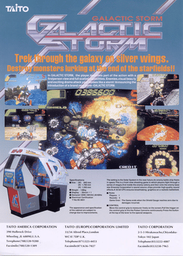 Galactic Storm is a chase-view shooter in the same vain as Galaxy Force or Taito's own Night Striker. The player controls a spaceship equipped with a shield to withstand multiple hits, in addition to the standard shot there is a also a more effective special weapon in limited supply available. After taking off, the player flies on a predetermined course with some limited maneuvering room through the stages, facing of against waves of enemies (giant robots for example). At the end of a level, a stronger boss enemy awaits. Once this obstacle has been defeated, the ship's shields get recovered to some extent and the player can continue the flight through various environments, including for example the wide-openness of space, planetscapes covered with trees, and narrow tunnels.