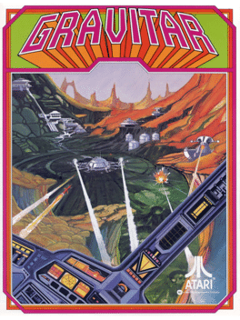 Gravitar is the Atari 2600 port of the arcade game of the same name, which is a color vector graphics arcade game released by Atari, Inc. in 1982. The player controls a small blue spacecraft in a fictional solar system with several planets to explore. If the player moves his ship into a planet, he will be taken to a side-view landscape. Unlike many other shooting games, gravity plays a fair part in Gravitar: the ship will be pulled slowly to the deadly star in the overworld, and downward in the side-view levels. In the side-view levels, the player has to destroy red bunkers that shoot constantly, and can also use the tractor beam to pick up blue fuel tanks. Once all of the bunkers are destroyed, the planet will blow up, and the player will earn a bonus. Once all planets are destroyed, the player will move onto another solar system.